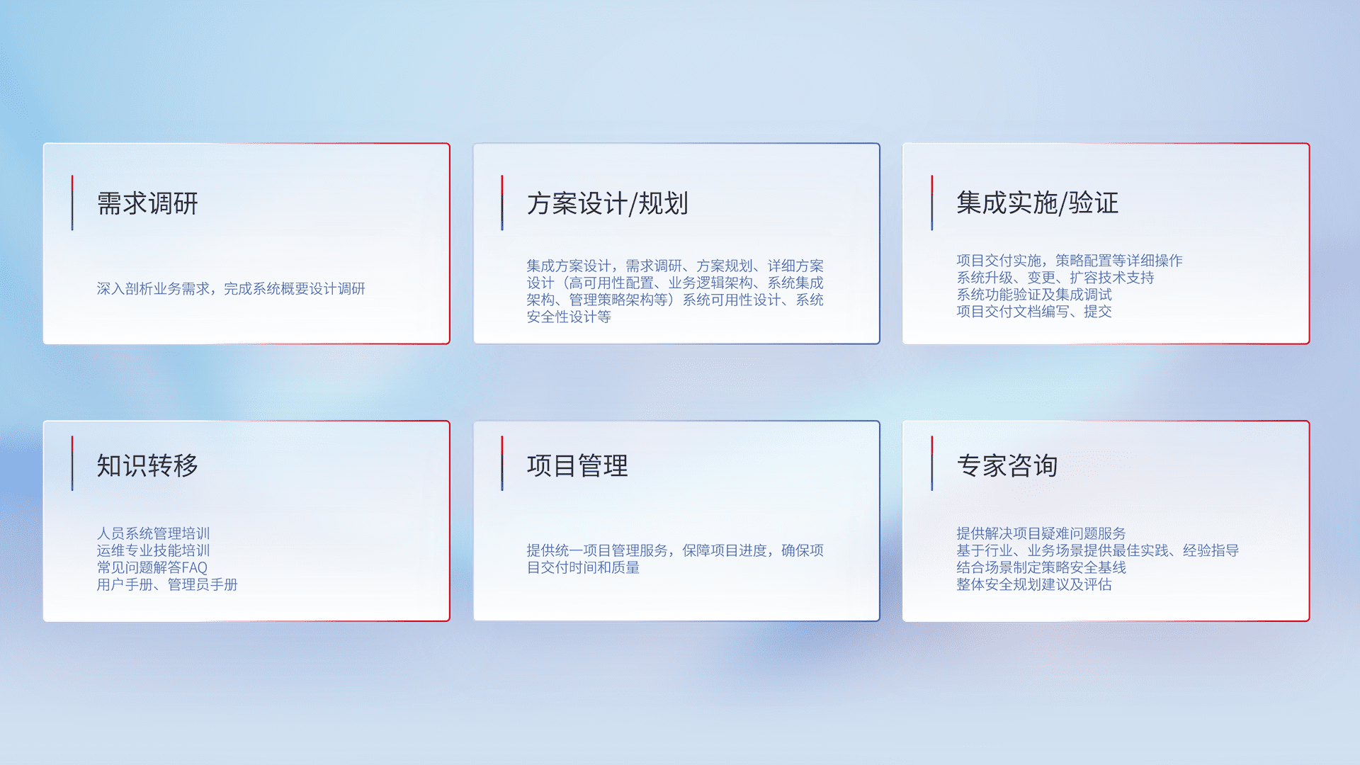 针对客户行业特性,,将宏观的安全战略和需求,,通过专业的交付服务,,,,实现项目落地,,,,为客户提供标准规范的集成交付服务。。。。